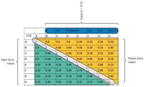 The relationships’ fuzzy values are used to define the routing architecture. This makes it possible for our system to draw inferences based on data ranges instead of a single discrete data point. The fuzzy causal matrix in Table 2 is created from the least common subsume (LCS) tree. An fuzzy causal matrix represents the corresponding event log, since the LCS tree in Figure 1 contains eight activities, . The matrix’s input cell (row, column) specifies how closely two activities are causally related. If the values for (row, column) are 1, then the activities are equal, meaning that activity A equals itself.