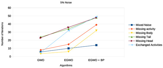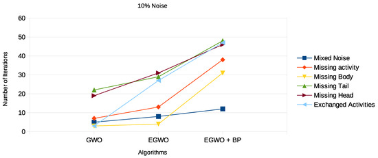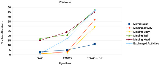 Again, we see that the smaller the net, the more frequently the GWO algorithm finds the correct process model. The higher the noise percentage, the lower the probability the GWO algorithm will end up with the original process model. However, the EGWO is more robust to noise than just the GWO as the percentage of noise increases. The best of them all is the combination of the enhanced GWO with backpropagation (EGWO + BP); it has the highest noise tolerance level. The use of backpropagation helps the algorithm achieve better process models by comparing the desired output model to the achieved model outputs. The models are tuned by adjusting weights to narrow the difference between the two as much as possible. It also updates the weights backward, from output to input. It does not have any parameters to tune except for the number of inputs, as seen in Figure 13, Figure 14 and Figure 15. We can make the following observations by looking at the results for the different noise types. The enhanced gray wolf with backpropagation (EGWO + BP) algorithm for process mining can handle the exchanged activities noise type well. It has less impact on the algorithm’s performance than the missing body and missing activity noise types due to the random generation of the initial population. Additionally, it can handle the missing tail noise type better than the other two.