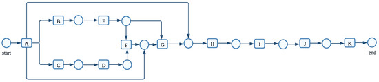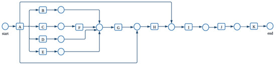 The activity names used in describing the various processes are as follows: (A) create fine; (B) receive result from prefecture; (C) insert date appeal to prefecture (D) send appeal to prefecture; (E) notify result appeal to offender; (F) appeal to judge; (G) send fine; (H) insert fine notification; (I) add penalty; (J) payment; (K) send for credit collection. In the above description, the uppercase letters A–K represent each activity name. According to the description, the flow control of activities in the event log [41] is depicted in the Petri net shown in Figure 16 using the traditional direct flows approach.