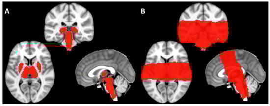 Spatial masks employed in the masked Independent Component Analyses. (A) Subcortical mask, including only the brainstem and subcortical nuclei; (B) Global mask, comprising the whole field of view.