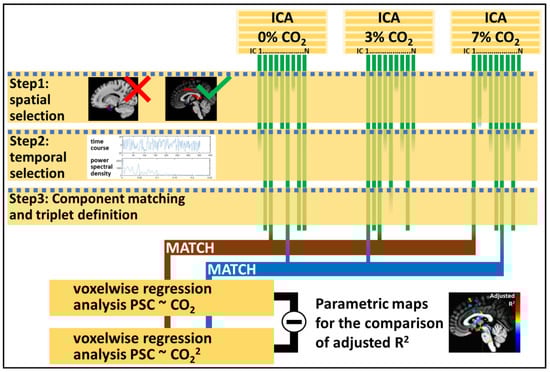 Proposed analysis pipeline: three separate masked Independent Component Analyses are performed on the three conditions. Extracted components (green lines) undergo three steps of selection. Step 1: Spatial selection, performed on maps by visual inspection according to criteria available in the literature [21]. Step 2: temporal selection, components whose temporal periodicity was similar to that of the task were accepted while components showing high-frequency peaks in the PSD were discarded. Step 3: Component matching and triplet definition: triplets were composed with components showing a mutual correlation above 0.5. Triplets of similar components express for each voxel and for each condition a percent signal change value. Two regression models (one linear and one quadratic) are fitted on the levels of inhaled CO2. The two models are compared in terms of adjusted R2. Positive differences are thresholded by imposing the three conditions reported in the Section 2.