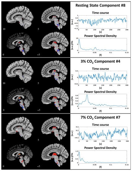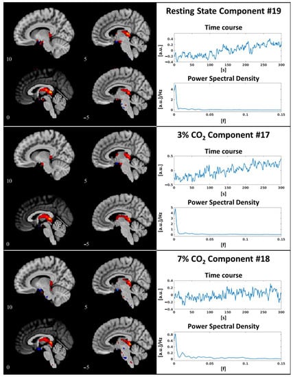 The component selection was performed first on the spatial domain, discarding components related to noise by gold-standard visual inspection, following criteria exposed by Griffanti et al. [21]. Then, for CO2_3% CO2_7% data, we evaluated the CO2-relatedness of the components surviving the first selection step, by visualizing their associated time course and their power spectral density. We discarded components that present high-frequency peaks (frequency above 0.10 Hz), and we included in the final selection the components that exhibited temporal periodicity similar to that of the task, i.e., components that present a maximum for the power spectral density function in a neighborhood of 1/60 Hz, i.e., the characteristic frequency of the task.
