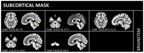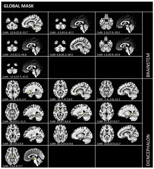- Bianciardi, M.; Toschi, N.; Edlow, B.L.; Eichner, C.; Setsompop, K.; Polimeni, J.R.; Brown, E.N.; Kinney, H.C.; Rosen, B.R.; Wald, L.L. Toward an In Vivo Neuroimaging Template of Human Brainstem Nuclei of the Ascending Arousal, Autonomic, and Motor Systems. Brain Connect. 2015, 5, 597–607. [Google Scholar] [CrossRef] [PubMed]