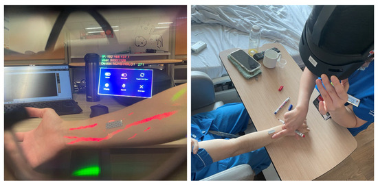 In the past, multiple fixed camera/projector solutions belonging to the “reflected light” classification have been proposed, which can be implemented as a wheeled venipuncture station in the ward [20,23]. These systems allow for a single-user operation, freeing up both hands for the procedure while keeping the overlay active. Due to the fixed operating distance, this class of devices is able to achieve accurate projections by leveraging on a fixed, pre-calibrated camera calibration and focus. However, these systems suffer from issues regarding ease of use and flexibility, owing to a larger and heavier footprint.