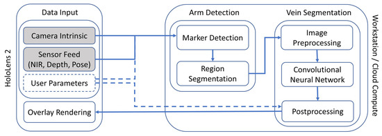 In order to simulate on-demand cloud computing resources, we use a dedicated workstation to process the raw sensor data received from the HoloLens 2’s depth and infrared camera unit into a vein segmentation point cloud, which the headset uses for rendering onto the user’s vision. The full computational pipeline is implemented with the Python 3 wrapper for OpenCV and PyTorch, and optimized for deployment with TensorRT [24,25].