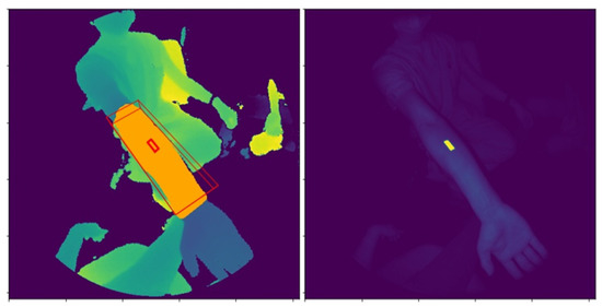 In order to extract an arm segmentation mask for downstream vein detection, given the 3D coordinates of the marker’s edges, a cuboid is defined around the marker, shown in red in Figure 3 (left). This allows us to define the length, width, and depth for the region to be segmented. 3D points are computed for all pixels in the Depth image and all points that fall within the cuboid are returned as the arm segmentation mask Mi, denoted as the orange pixels in Figure 3 (left).