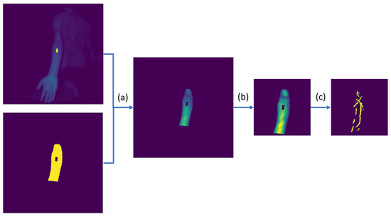 Once we segment the arm as shown in Figure 4a, the non-arm regions of the NIR image are set to zero. Additional preprocessing steps, shown as Figure 4b, are done before the final vein segmentation. In [27], a learned spectral decomposition filter was applied to preprocess the NIR image. However, by leveraging on the paired depth-infrared sensors, we can precisely segment out the arm’s ROI in 3D as described in Section 2.2, making a simple contrast enhancer (e.g., normalization/CLAHE) effective when applied to the filtered pixel intensities. The full preprocessing steps involve the following: