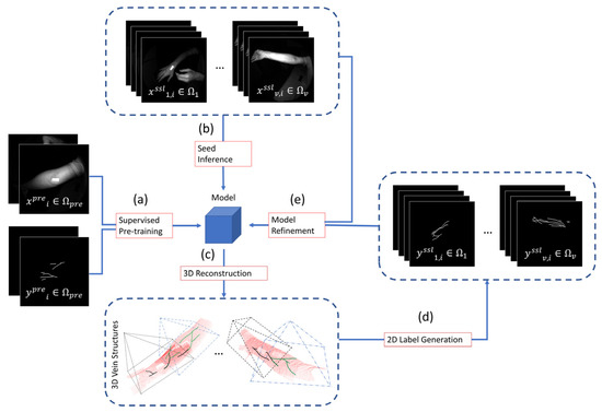 While NIR imaging helps to improve the contrast between veins and the surrounding tissue, gathering a large-enough high-quality dataset to train a robust and generalizable model is tedious and would require medical expertise and multi-annotator consensus to reduce inter-user subjectivity. Existing deep learning solutions for vein imaging and detection are fully reliant on traditional supervised learning techniques [14], working with labeled datasets that are many orders of magnitude smaller compared to baseline datasets such as ImageNet [19]. To this end, we initialize and train our base model using a small and partially annotated dataset. Utilizing the other sensors on-board the HoloLens 2 device, we designed a 2D–3D accumulation and re-projection pipeline to automatically annotate a larger unlabeled dataset that is then used to fine-tune the model.
