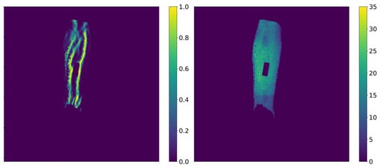 Reprojections from point cloud, accumulated across the whole session, back onto each frame. (Left) Density map D shows the reprojected vein prediction value, averaged over vein predictions made from different distances and angles across the whole session; (right) Sample count map C shows the number frames across the whole session where each point on the arm was visible and sampled from. Note the brighter middle portion, which was in view for most of the recording, and the darker rectangles, which were locations where the marker was placed, blocking the view of the underlying skin for different parts of the recording.