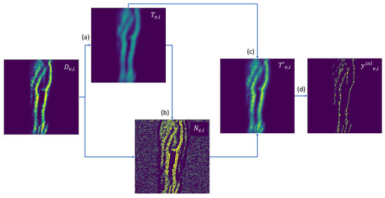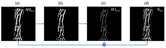As illustrated in Figure 8, the threshold map T is then applied to the prediction density map D to produce a binary image M0. A morphological opening step is applied (erode–dilate cycle with 3 × 3 window for 2 iterations) to M0 for noise removal, followed by a morphological thinning operation for width standardization [37,38], yielding M1. The difference between M1 and M0 gives N (Figure 7b), which denotes uncertain regions (e.g., small segments removed by the erode–dilate cycle, or border pixels in thick line segments). To reflect this uncertainty, for every noise pixel found in N, the corresponding value in T is set to D, with results stored in T′ (Figure 7c), to be used to compute a loss-weighing factor in the next section. As a final step before model training, a binary vein segmentation mask is computed as D > T′ (Figure 7d).