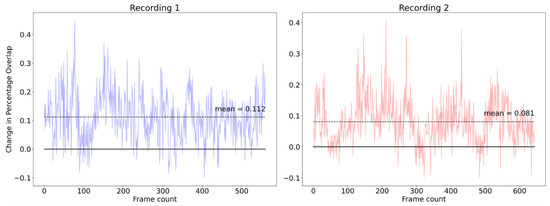Change in frame-to-frame segmentation consistency for two sample recordings, with positive values denoting an improvement in temporal stability.