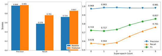 We further investigated the model’s performance on the test set across super-epochs. From Figure 11 (right), we can see that the curriculum-based refinement process results in stable and consistent improvements in precision and recall, respectively. This shows that the process gradually increases the confidence and predicted veins are largely correctly attributed, and hence does not adversely affect precision even while drastically improving recall. In the medical context, a high precision is of the highest importance, due to the implications of false positives in terms of patient safety.