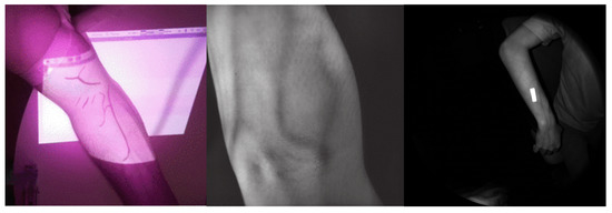 Comparison between typical arm/vein views for different vein detection systems, in [14,21] and ours from left to right, with images from prior work extracted from original papers and the right-most image showing the typical view from a head-worn setup. All images are of 512 × 512 resolution.