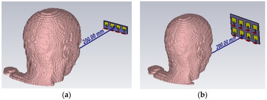 In order to assess the exposure spatial variability of a human body part (head) during the daily use of a wireless device, we imported the upper section of the human adult female model (Laura); namely, the head, from CST MWS Studio library. Dielectric properties of the tissues of the head were chosen instead of resonance frequency according to the literature [35]. The boundary conditions were set as perfect matched layers (PML) with 20 cells of free space and 7 cells per wavelength. The phased-array antennas were placed, one by one, at a fixed distance of 20 cm from the head, as we can see in Figure 2, for further dosimetric analyses.