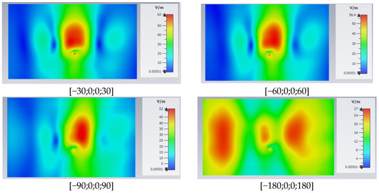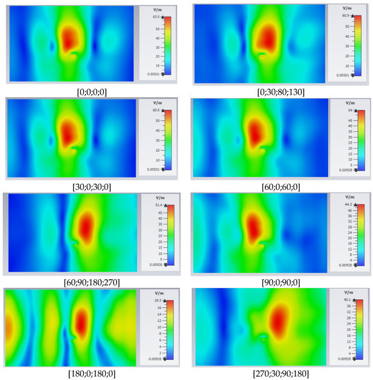 Figure 3 depicts the E-field level distributions in the planes parallel to the antenna array, at tangency to the head and related to each phase difference (which is equivalent to a specific beam steering direction). The color scale range includes all values of the E-field strength in that plane, between the minimum and the maximum value. For the case [180;0;0;180] degrees phase difference, the lowest E-field strength was obtained; namely, 18 V/m, because the antenna array has the lowest efficiency at this configuration. The maximum E-field strength was 63.5 V/m and corresponded to the phases case [0;0;0;0]. Although in this situation gain was not the highest, the maximum E-field strength still appeared; therefore, we can state that the use of the phase difference between the elements of the antenna conducting a high gain does not lead to the highest values for E level (V/m).