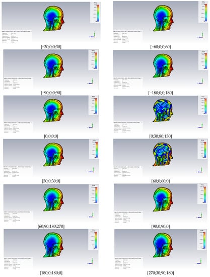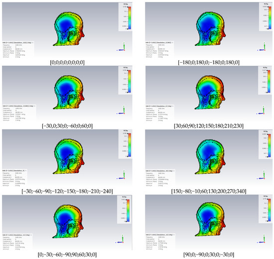 We notice that the SAR distribution is completely different for the cases [0,30,80,130] and [60;0;60;0] compared with the others (Figure 4). This is primarily due to the fact that the angular width of the main radiation lobe is large and, secondarily, because it is oriented in a direction that does not coincide with the normal incidence to the head model surface. In addition, in these two cases, a linear variation of the SAR values inside the human head was not identified because, for instance, higher SAR values were obtained in the brain rather than in the bone or muscle tissues of the head.