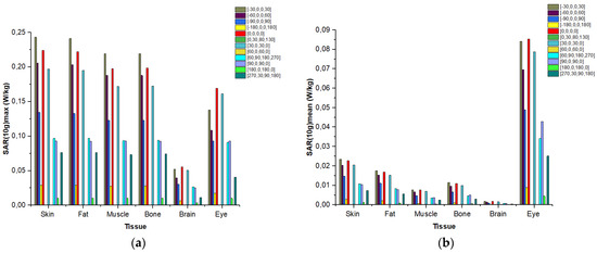 Although previously we obtained the peak values of SAR in the skin tissue, when determining the average values of this parameter in the entire head model we obtained the highest values of SARmean in the eye tissue. For example, in the case of phase shifts [−30;0;0;30] degrees, there is a difference of 0.06 W/kg between the SAR absorbed in the eye tissue and the SAR absorbed in the skin. The lowest values were recorded in the brain. In Figure 5b, we can see that the bone tissue absorbs a greater amount of energy than the muscle tissue for all cases of phase shift used.