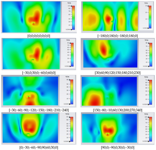 Compared with the four-element antenna, in this case there are different distributions of the electric field in the eight phase-shift situations. In this sense, we do not observe a clear rule for the path of energy distribution; for example, in the case [30;60;90;120;150;180;210;230] phase differences, the main radiation lobe is more directive and narrower when compared with the case [0;−30;−60;−90;90;60;30;0], where the energy is spread on a larger surface and the main lobe is less directive.