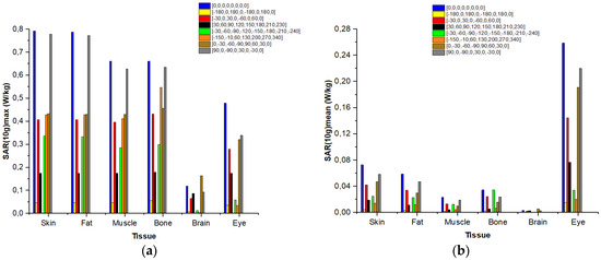 (a) SARmax(W/kg) and (b) SARmean(W/kg) inside tissues models according to phase shifts between the elements of the planar 2×4 array antenna.