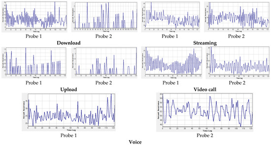 The recurrence histograms (Figure 10) usually show the characteristic periodicity of the time series E-field level emitted during application running. Time lag is represented on the abscissa, and the percentage of recurrence is represented on the ordinate. We observe a dense structure of the graphics related to the download (Probe 1), video call (Probe 1) and streaming (Probe 1) applications, which indicates a degree of determinism at these exposures. For streaming, video call and voice call, we observed that signals have a certain trend, a fact also encountered in determination of RQA parameters.