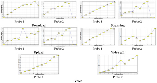 Figure 11 highlights the correlation dimension charts corresponding to all five mobile applications. Embedding dimension is represented on the horizontal axis, and the correlation dimension is represented on the vertical axis The correlation dimensions suggest that streaming (at Probe 1) has a behavior similar with random signals, because there are no certain patterns identified, or no saturation points are present. At the same time, the other applications result in a distinct spatial structure of exposure; in this sense the CD parameter becomes saturated at a certain point as the embedding size increases. This type of behavior can be associated with chaotic emissions.