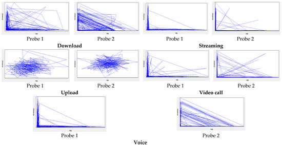 Phase space is an abstract multidimensional space that is used to graphically represent all possible states of a dynamic exposure. In Figure 12, we notice that for download application emissions produce phase-space representations which display dense lines that follow a clear rule of diagonal direction. For the streaming application, we highlight a weak presence of signal states, which indicates the random nature of the signal. For the upload application, we observe similar trajectories which follow the same rule. For the videocall and voice call applications, the same rule used for displaying signal states in download application case is maintained.