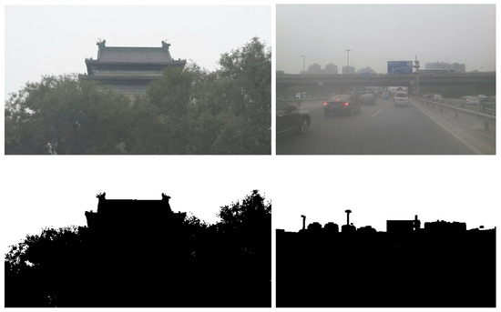 where the parameter is used to make distant objects have a small amount of haze, which was set to 0.95 in [7]. As for the estimation of atmospheric light , we also use the method of He [7]. First, we select the 0.1% brightest pixels in the dark channel and then take the average value of the pixel values in the corresponding input image as the estimated value of atmospheric light.