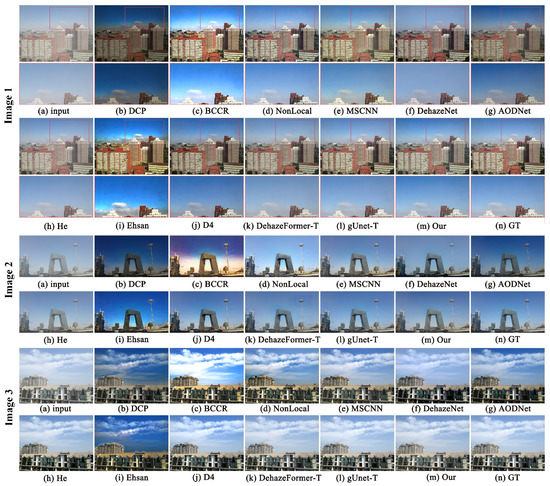 We randomly sampled several images from SOTS-Outdoor (from RESIDE dataset) for experimental comparison. The visual comparison is shown in Figure 3. For Image 1, the result of restoration via DCP is overall darker; the image restored by BCCR is a bit overexposed; the result of restoration by He’s method has more haze; the color restoration result of AODNet and Ehsan’s method shows a great change; the result of restoration by NonLocal, MSCNN, DehazeNet, and D4 has color distortion; the result of restoration by our method is closest to ground truth (GT)—the sky area is very well protected. For Image 2 and Image 3, the restored results of DCP, BCCR, AODNet, and Ehsan show severe color distortion. He’s method was not effective in dehazing, and the restored results of NonLocal, MSCNN, DehazeNet, and D4 show overexposure or overexposure in the sky region. The overall restoration effects of DehazeFormer-T and gUNet-T are better, but the restoration results of the sky region in Image 1 are slightly different from those of GT. The result recovered by our method is closest to that of GT. The comparison of visual effect experiments shows that our method can well protect the sky region of the image, which solves the problem that DCP fails in the sky region.