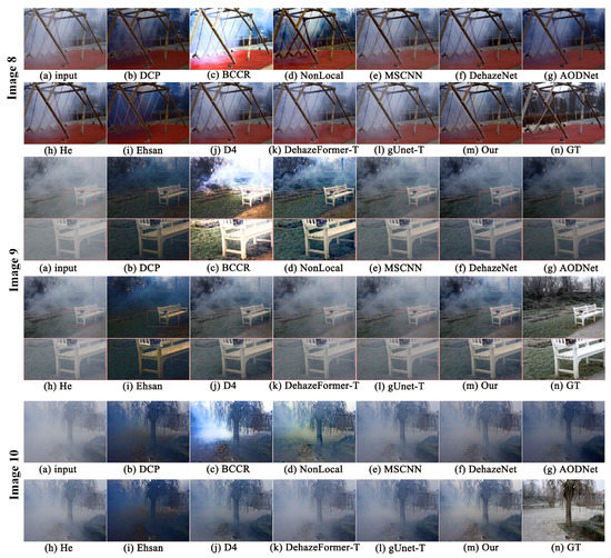 Figure 5 is a comparison on the NH-Haze dataset. The haze in each image in this dataset is relatively thick. The images restored by methods such as DCP, AODNet, and Ehsan are too dark or oversaturated. The image recovered by BCCR is overexposed. The images restored by MSCNN, DehazeNet, He, and D4 methods still have more haze; and the images restored by NonLocal have less haze, as shown in Image 8, which may be because the non-local prior has a better dehazing effect on uneven haze, but the scene color shows some distortion. In Image 9, the results recovered by DCP and Ehsan are darker; the result of BCCR is overexposed; and the results recovered by MSCNN, He, DehazeFormer-T, and gUnet-T have more residual haze, such as the area shown in the red box. The scene details restored by NonLocal feel good, but the color of the haze is changed, making it the same in Image 10. The image restored by our method is relatively closer to GT in terms of color and saturation, but there is still a certain amount of haze, which is where our future work can be improved.