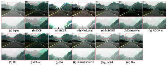 Comparison of visual effect after haze removal of a hazy image collected by traffic road electronic monitoring. (a) Hazy input, (b) DCP [7] results, (c) BCCR [9] results, (d) NonLocal [10] results, (e) MSCNN [15] results, (f) DehazeNet [41] results, (g) AODNet [14] results, (h) He [39] results, (i) Ehsan [40] results, (j) D4 [49] results, (k) DehazeFormer-T [50] results, (l) gUNet-T [52] results, (m) our results.