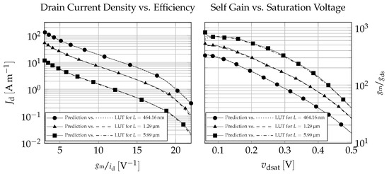 When sizing transistors, however, designers do not have this luxury of specifying desired electrical behavior and looking up a conversion into geometrical sizing parameters in the PDK manual. While the equations mapping terminal voltages and geometries to operating point parameters exist in the device models [46,47], they are not easily rearranged and only grow in complexity with each new version. As such, this would require function optimization with a simulator in the loop to find geometrical parameters that result in the desired electrical behavior. The search space, spanned by possible combinations of widths and lengths for multiple devices in a circuit, is considerable and difficult to constrain. It would be much more intuitive for a circuit designer, however, to constrain the parameters of the electrical domain, such as the speed () or the efficiency () of a device. In many cases it is possible to fix such an electric parameter to a specific value, greatly reducing the search space. A technology-dependent way of translating desired operating point parameters into widths and lengths would lift the design problem into the electrical domain. Here, the task can be viewed as entirely decoupled from the technology and geometries. Once a design point, consisting of the desired electrical behavior of the transistors, is found, it is the responsibility of such a translation function for a given technology to produce the correct widths and lengths, resulting in this specified electrical behavior. That way, the same operating point can be reproduced, provided the function exists for a PDK. If the electrical behavior of individual devices is reproduced, the performance of the overall circuit should be comparable as well.