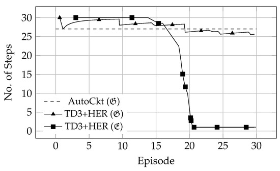 As the motivation, before going into deeper detail about the implementation, an attempt was made to reproduce the results reported by [34], with the method presented here, utilizing a continuous action space in the electrical domain in conjunction with the HER buffer. For this comparison, two agents were trained on the Miller operational amplifier, shown in Figure A1b, one with an electrical () action space and the other with a geometrical () one. Figure 3 shows the average number of steps it takes these agents to reach a given goal state, sampled at the beginning of the episode, where this goal state is defined by the same parameters , UGBW, PM, and current consumption () [34]. These results indicate that training with a sparse reward signal and HER in addition to the continuous action space improves the navigational capabilities of an agent even in the domain. Additionally, it shows how much easier it is for an agent to find a satisfactory solution in the electrical design space. Here, it takes the agent steps to reach a goal state, which is faster than in the results reported by Settaluri et al.