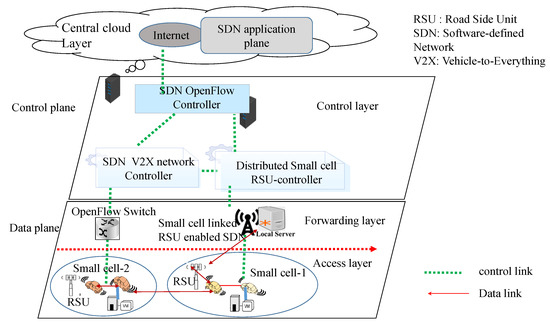 Vehicles and road users are included in the data plane. V2X services also include V2N, V2I, V2V, and V2P links. Furthermore, the V2X onboard access unit is regarded as an SDN device, much like the data plane in the SDN approach. Functions of the SD onboard wireless communication are discussed later in this section (Section 3.2). In the V2X access layer of the data plane, the SD-onboard wireless vehicle primarily collects data, forwards it, queues it, and sends it into the small cell-linked RSU node. Furthermore, the forwarding devices, such as the OpenFlow V2X network switch and a small cell-linked RSU-enabled SDN, are included in the forwarding layer.