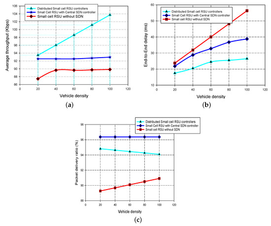 Impact of intelligence based on SDN controller over the proposed architecture versus vehicle density: (a) average throughput; (b) E2E delay; (c) packet delivery ratio (PDR).