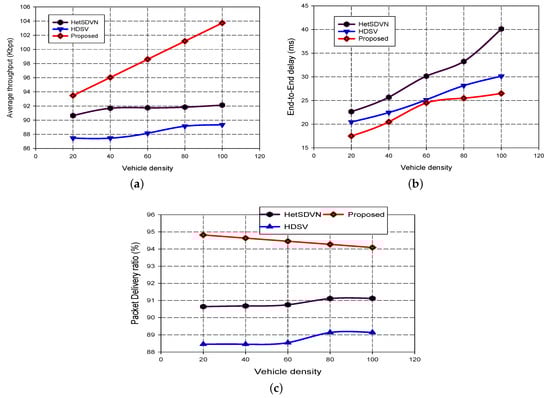 Evaluation performance of the proposed architectures with HSDV, HetSDVN versus vehicle density: (a) average throughput; (b) E2E delay; (c) packet delivery ratio (PDR).