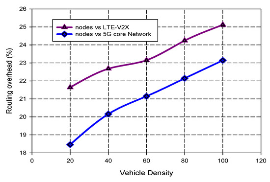 Figure 6 shows the routing overhead with varying vehicle densities. The proposed 5G V2X networks’ routing overhead increases with traffic density. This is because establishing a cluster head near the source vehicle increases the routing messages while distributing packet responses to the destination node. As a result, the input topology is routed to SD-SmCH flow entries in the distributed small cell RSU controllers, resulting in fewer beacon messages exchanged between the source vehicle and the small cell RSU. However, when compared to the use of the 5G V2X core network, the SDN-based approach, aided by distributed small cell controllers and the central controller, is the foundation of the lower routing overhead. The small cell RSU node communicates with the SDN controller only if the flow entries in the distributed small cell RSU controller do not match the routing rules. The more distributed local controllers use the input topology to construct the route information, the lower the link failure by lowering the routing overhead. The routing overhead of the proposed architecture assisted with the 5G core network is 22.15 at the vehicle of 80, whereas it is 24.44 for LTE-V2X communication.