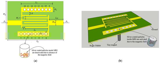 The expressions in Equations (1)–(5) indicate that various phase shifts from the P-CRLH unit cell can be obtained by changing the values of left-handed parameters and . The values of and are controlled through the activation of the silver-coated magnetic particles embedded in the structure. Practically, the value of is varied by changing the physical lengths () of the shunted stub transmission lines in Figure 1a. The physical lengths of the stub transmission lines are changed by activating the MRSs along their lengths numbered from 1 to 16. Similarly, by varying the spacing among the fingers , different values of are obtained. The phase response of the P-CRLH unit cell is a complex function of mainly four parameters () that is calculated using the expressions in Equations (1)–(5) once the physical values of these parameters are determined.