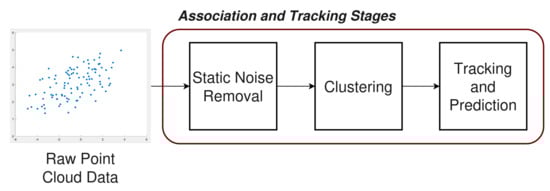 The association and tracking component of a mmWave tracking system should fundamentally consume the information that illustrates reflection points, deduced in Section 2.2 of this paper. Using this information, usually in point cloud format, the process illustrated in Figure 5 highlights the typical stages involved in achieving a set of continuously tracked objects from the obtained point cloud data.