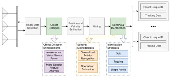 The final component of a mmWave tracking system is any sensing and identification strategies that might be employed in addition to the core tracking architecture. The desired outcome of this component of the system is to ultimately perform a particular sensing or identification task and associate the outcomes with the tracked objects. It should be noted that this stage is not required in a system where the sole objective is to simply perform multi-object tracking. Nevertheless, this stage has been included for discussion in this paper as it serves an important role in the idealized unified tracking and sensing framework, ultimately achieving more elaborate tracking profiles. Currently, there is no typical/generalized way this component of a mmWave tracking system is achieved.