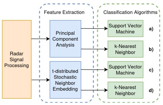 The authors of [25] attempt to classify these walking patterns comparing the performance between an approach using k-Nearest Neighbor (k-NN) and SVMs. The four system designs explored in the work presented by [25] can be seen illustrated in Figure 7. In [25], both the range-Doppler and Doppler-time data are incorporated into feature extraction. In the research presented by [25], the impact each of the walking patterns has in the range-Doppler and Doppler-time maps is illustrated in the form of a heat-map. It can be seen in this illustration, that the change in walking speed (the difference between slow and fast walking) results in a dramatic change in the range-Doppler and Doppler-time maps. Whereas, maintaining a consistent walking speed and with hands in the pocket has less of a notable difference.