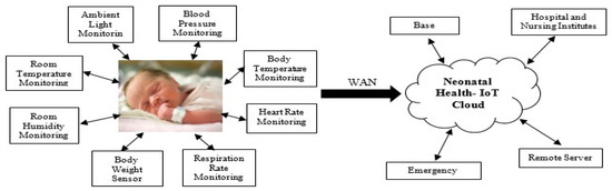 The article [27] discussed essential parameters for monitoring a newborn’s health, such as sleeping activity, oxygen level, respiration patterns, etc., necessary for ensuring salubriousness for their health. This approach lets parents observe the patient and ensure their good health. Another article [28] presents critical parameters such as body temperature, pulse rate, and moisture for monitoring patient health. It also presents the storage for measured values on the cloud with suitable security. In [29], a low-cost incubator for monitoring premature baby health is proposed. It majors the critical health parameters in real-time. It automatically sends the alerts and immediately takes necessary actions to safeguard babies. IoT-based flexible, pervasive, intelligent healthcare platforms for various healthcare, physiological, and environmental parameters monitoring are discussed in [30,31,32]. Sun et al. defined a privacy-aware and lightweight fine-grained access control mechanism for IoT-oriented smart health [33].