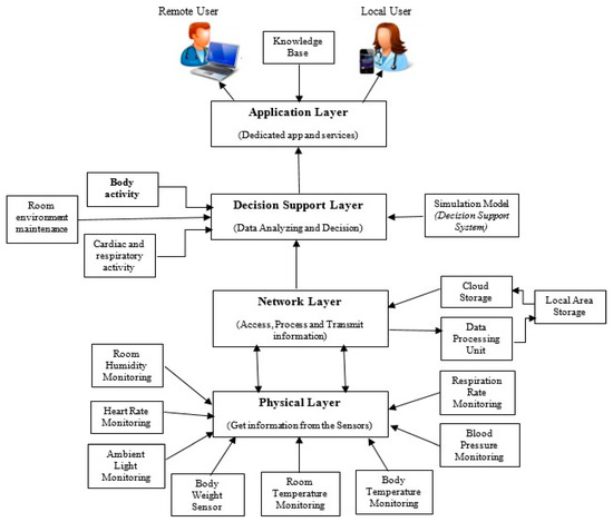 The network layer is connected to the processing unit for processing collected data and storage devices. After processing the data, the network layer transmits the data to the decision support layer. In this layer, the decision regarding the health of the patient is simulated. The choice is based on body activity, heart/respiratory activities, and room environment. An alert or a warning message will be generated based on data collected within 30 s. The messages are then transmitted to the application layer for further processing. The application layer then sends information to a local or remote user based on its knowledge base.