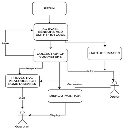 The proposed algorithm’s main objective is to design an IoT-based system with high reliability and accuracy by synchronising the sensors and other devices used to implement the system. The flowchart for the proposed model is represented in Figure 11.
