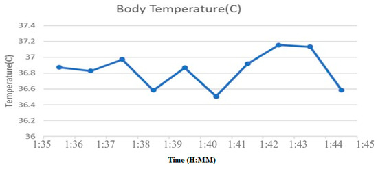 The proposed system was deployed for collecting real-time patient body data and was analyzed in terms of accuracy. The sensors’ performance was observed to be highly accurate and operated at low voltage. It was also observed that these sensors are designed to reduce errors and save power. This section analyses the data collected and the accuracy calculated of temperature, heart rate, and humidity sensors. MAX30205 was used to gather the body temperature. The data are collected daily at regular intervals. Figure 6 presents a small range of data collected for body temperature on 20 November between 1:35 PM and 1:45 PM. The sensor converts the measured temperature into a digital form using a sigma–delta analogue to a digital converter. The sensor was observed as highly accurate, with an accuracy of 0.1 °C between 37 °C and 39 °C. It has a temperature resolution of 16 bits and operates at a supply voltage ranging from 2.7 V to 3.3 V. Figure 6 presents the graphs between the operating characteristics between accuracy and temperature for the deployed human body temperature sensor.