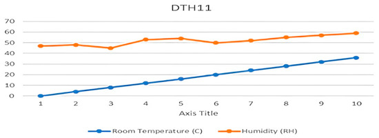 It relates to a high-performance 8-bit microcontroller to provide fast response, excellent quality, and anti-interference ability, and it is cheap. DHT11 is highly accurate in calibrating humidity. Table 3 presents the operational characteristics analysed during the deployment of DHT11 for humidity and temperature. Figure 10 shows the graphs between the data collected for room humidity and temperature. Equation (1) is used to calculate the accuracy of DHT11.