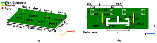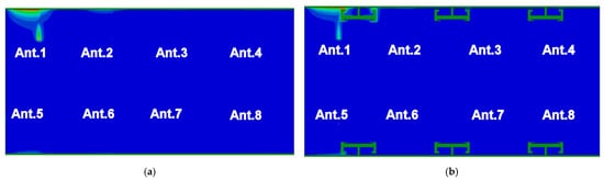 Figure 3 shows the current distribution on the ground when Ant. 1 is energized while all others are terminated to 50-ohm impedance. A little current spreads across Ant. 2, which is non-desirable and leads to lowering the isolation level. For this reason, we employ an E-shaped resonator to restrict undesirable currents, as illustrated in Figure 3b. With no decoupling structure, the isolation is −19 dB, while the isolation improves to more than −21 dB with the decoupling structure. The advantage of the decoupling structure can further be deduced by looking at Figure 4a,b.