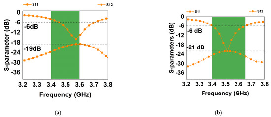 Simulated S-parameter (a) with no decoupling element (b) with the decoupling element.