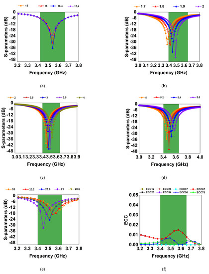 Scattering parameter plots (a) parametric study of the parameter L (b) parametric study of t parameter (c) parametric study of d parameter (d) parametric study of g parameter (e) parametric study of I parameter (f) envelope correlation coefficient.