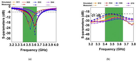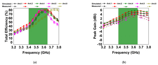 Figure 6a depicts both the simulated values as well as the measured reflection coefficient plot for Ant 1 through Ant 4. This work achieved a magnitude better than 18 dB for the four antennas, covering the (3.4–3.65) GHz. Figure 6b shows the port isolation plots between the neighboring antennas, for which we obtained isolation better than 21 dB in all possible combinations. From the depicted measured antenna efficiency in Figure 7a, it is clear that our system achieved an efficiency value between 34–76% within the frequency of interest with antenna 8 having the maximum efficiency of 70%. We consider the minimum and maximum efficiencies of the antennas as quoted in Table 2. Figure 7b indicates the gain of the antenna. A gain value higher than 3.1 dB is obtained with a maximum value of around 4.8 dBi. Note that the maximum value of the gain is quoted as provided in Table 2.