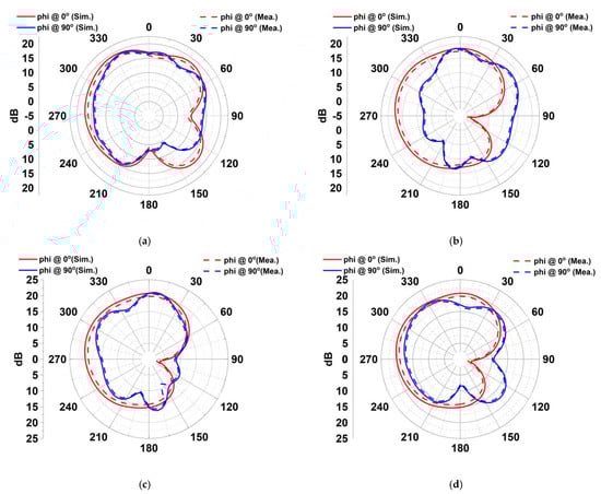 The 3.5 GHz band 2D radiation patterns for Ant. 1–4 are shown in Figure 8. The solid lines denote the simulated results, while the dotted lines are the measured results. It is quite evident that antenna 1–4, at both Φ = 90° and θ = 0°, have strong radiation in almost all the planes. Despite minor differences between the measured and simulated results, there is a general trend between the two findings, and the tiny discrepancy is related to the test settings. In conclusion, variation in maximum radiation orientations results in a diverse pattern, which contributes to the general diversity performance of the MIMO antenna.